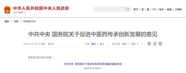 2019年10月25日,全国中医药大会在北京召开,习近平主席、李克强总理对中医药发展作出重要指示和批示,中共中央、国务院发布关于促进中医药传承创新发展的意见。